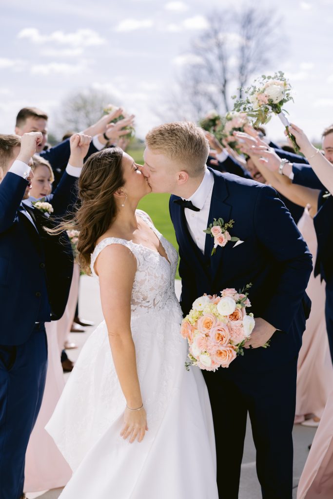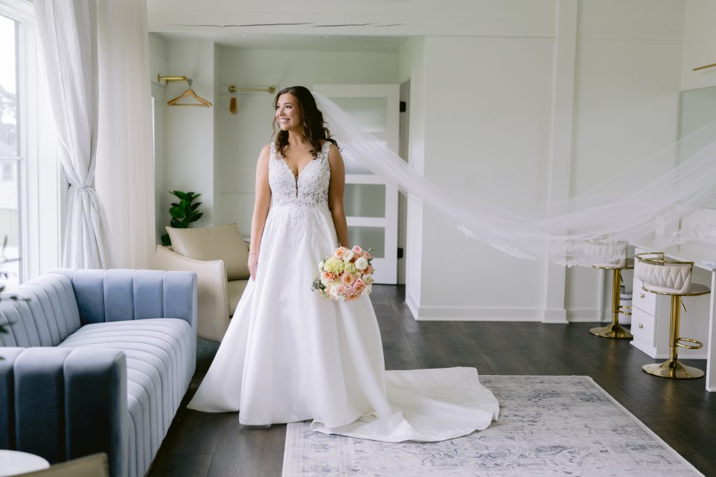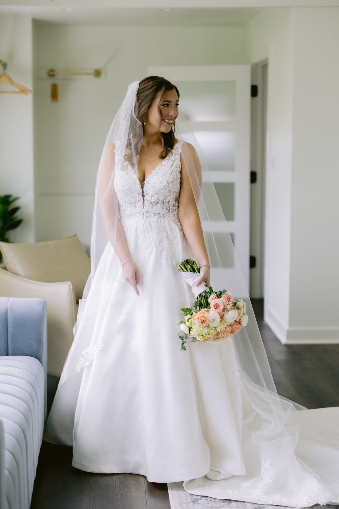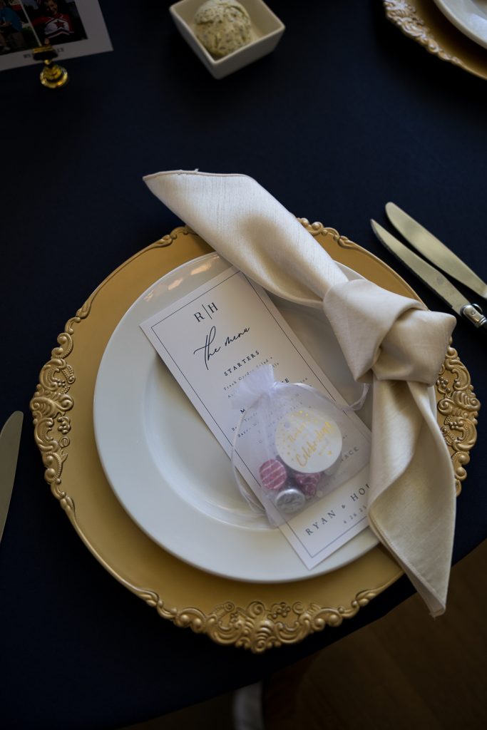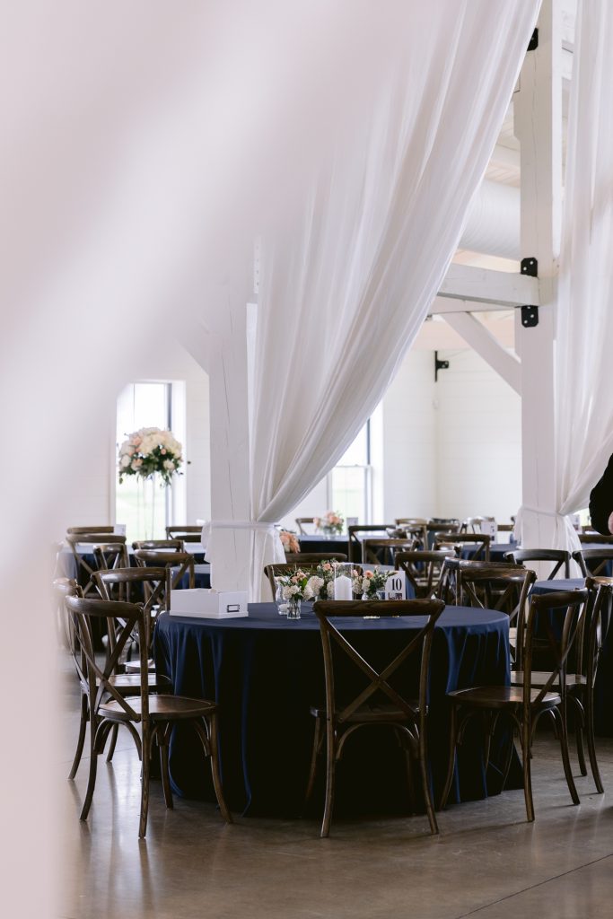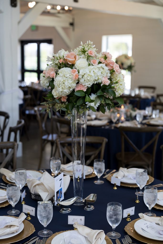 Working behind the scenes to make the day run seamlessly was the team at Luva Events. Their touch was everywhere, from the drapery to the perfectly set tables featuring navy linens, gold-rimmed chargers, and custom menus. The floral design tied it all together, using lush peach garden roses, white ranunculus, and green hydrangea to create a look that was both polished and organic.