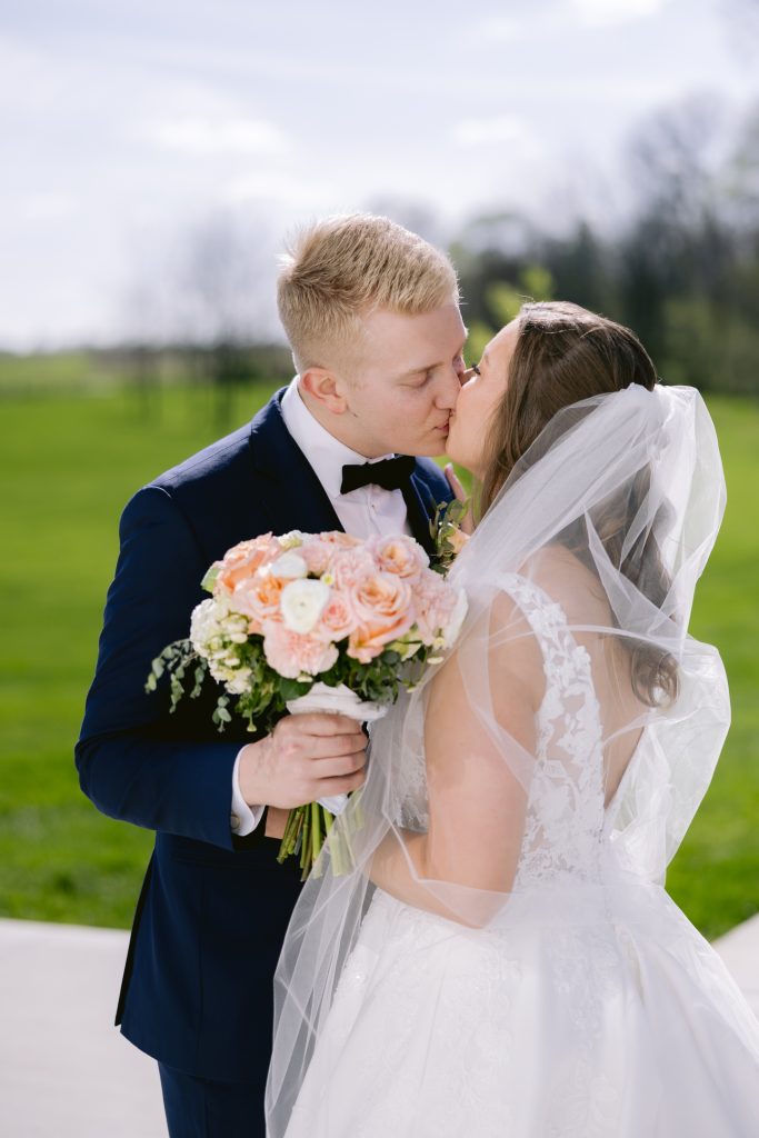 Bride in pearl-detailed veil and groom in black tuxedo share a kiss while holding white orchid and rose bouquet