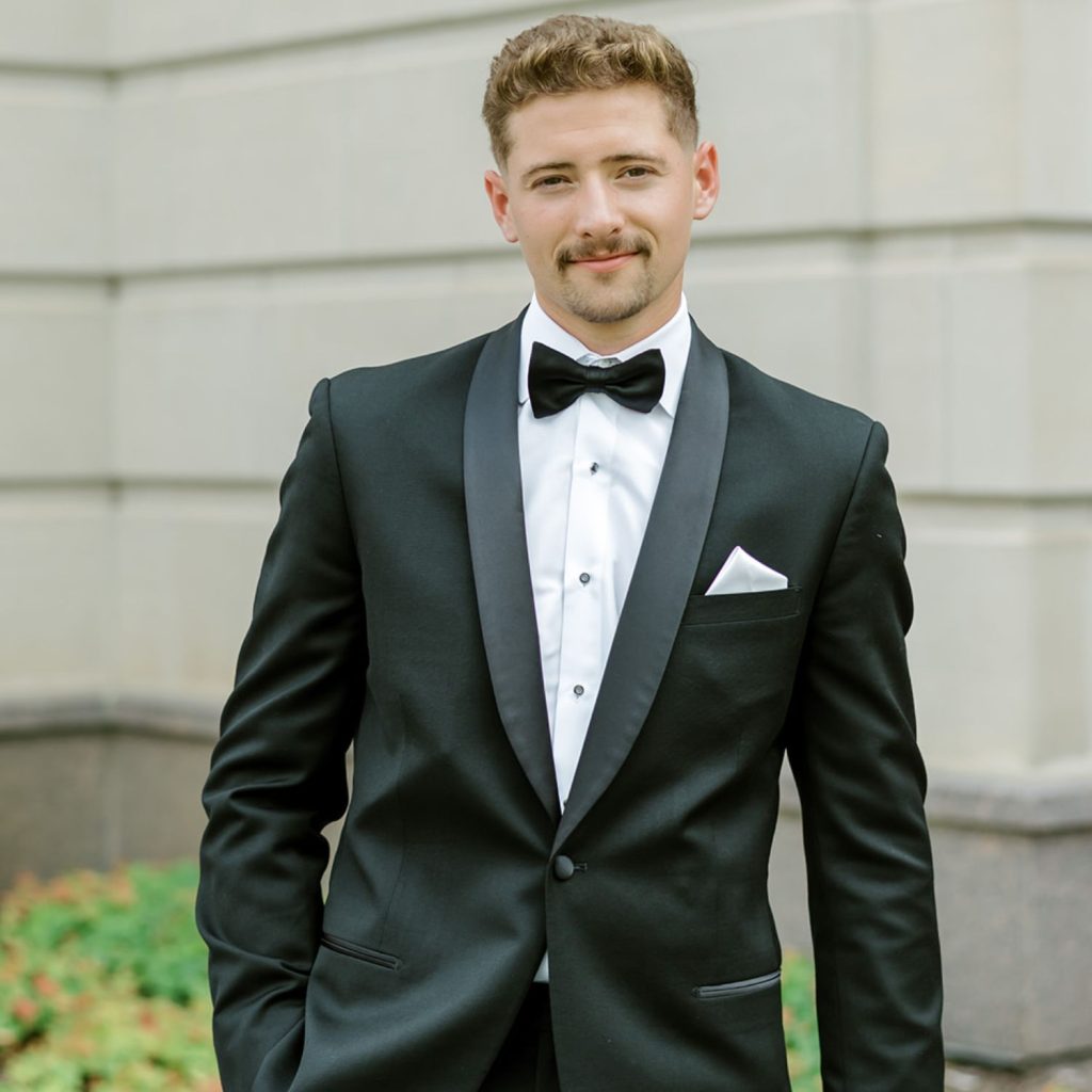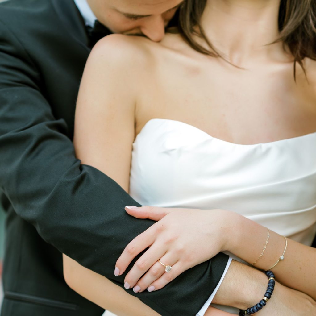 Mary’s emerald cut diamond ring and wedding band came from Barrington Jewels, while Max wore an Ike Behar Braydon shawl lapel tuxedo from Louie’s Tux Shop, styled with matching slim-fit trousers, a black bow tie, and an ivory pocket square.