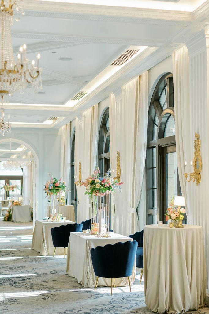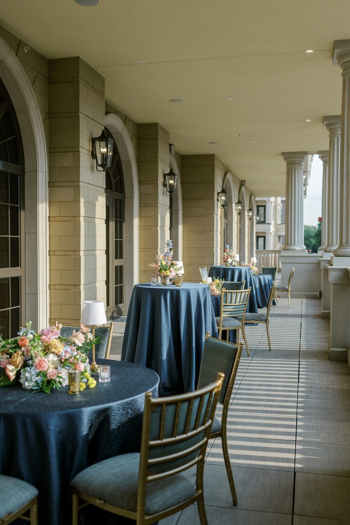Custom décor and rentals by Ace Party Rental played a major role in shaping the look and feel of the celebration. Highlights included a candy cart built specifically for the event, soft seating arrangements, gold shelving at the food stations, custom four-foot banquet tables designed for intimate seating groupings, a dance floor cut specifically for the Hotel Carmichael space, and blue draping that framed the band and added depth to the reception.