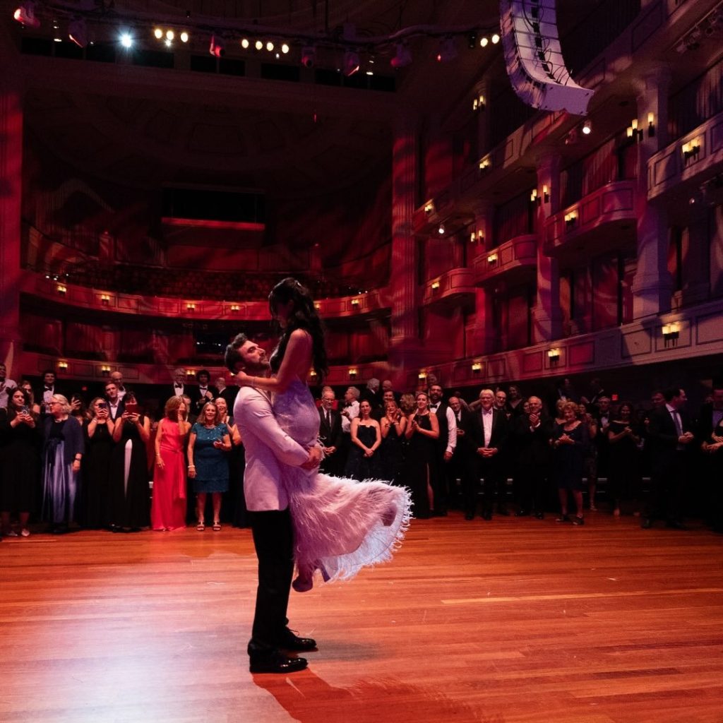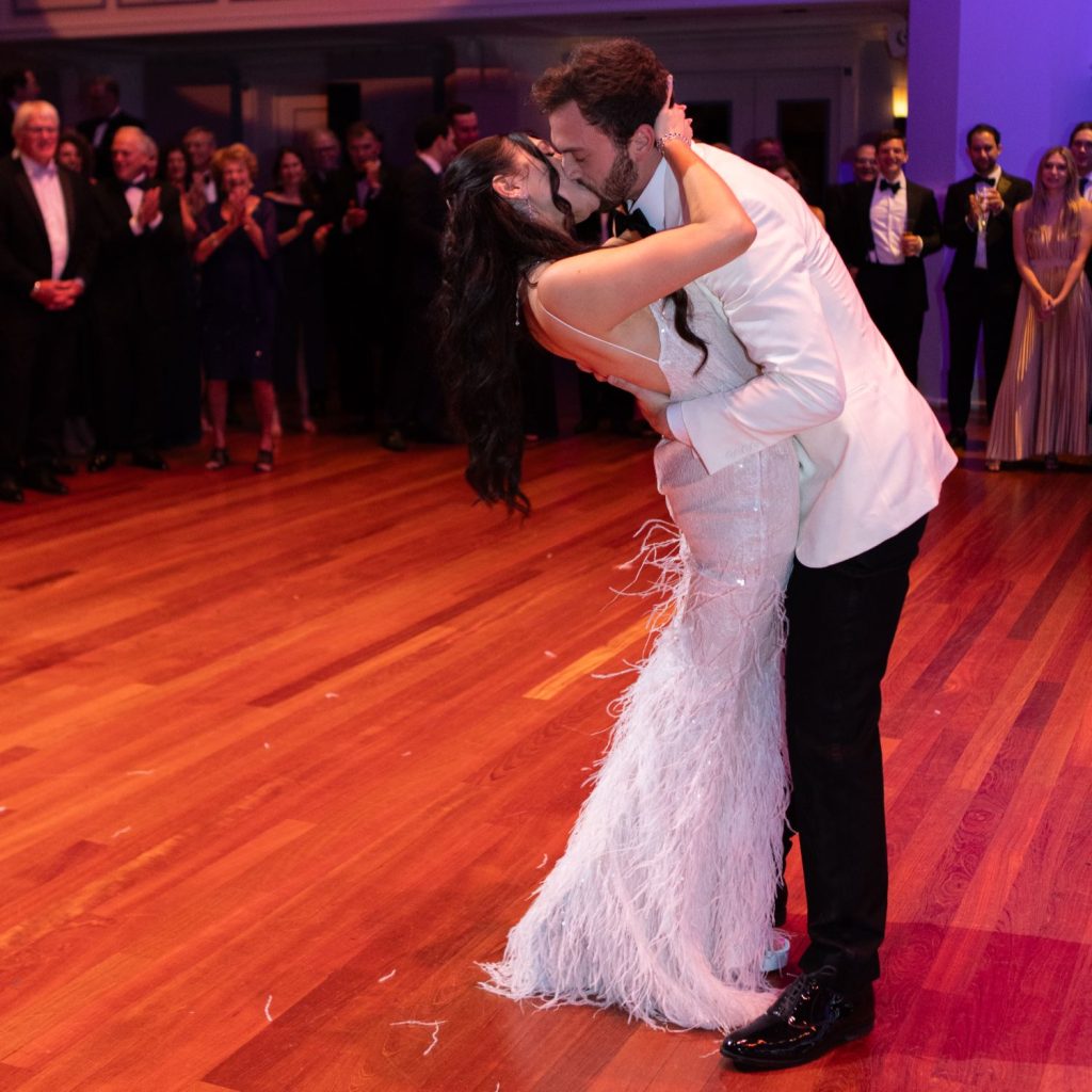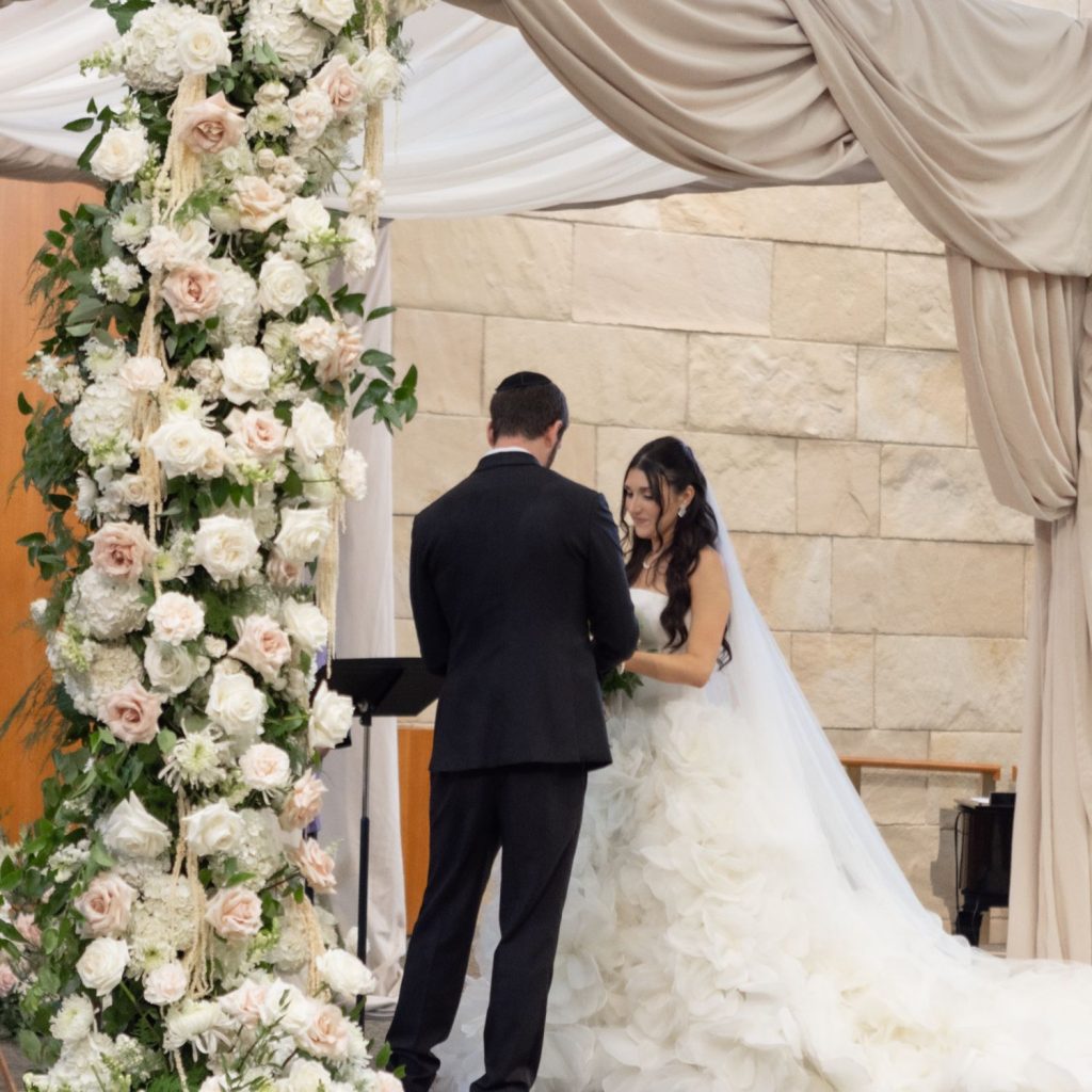Ace Party Rentals, an Indianapolis wedding rental company known for its custom designs, helped bring that vision to life. They provided the dramatic red lobby drapes and custom-built gallery wall design that greeted guests as they arrived. Inside the reception, Ace also supplied the black flatware, dishware, reception chairs, hora chairs, and the backdrop for the DJ. For the ceremony, their team created the elegant Chuppah structure and draping that beautifully framed the couple as they said “I do.”