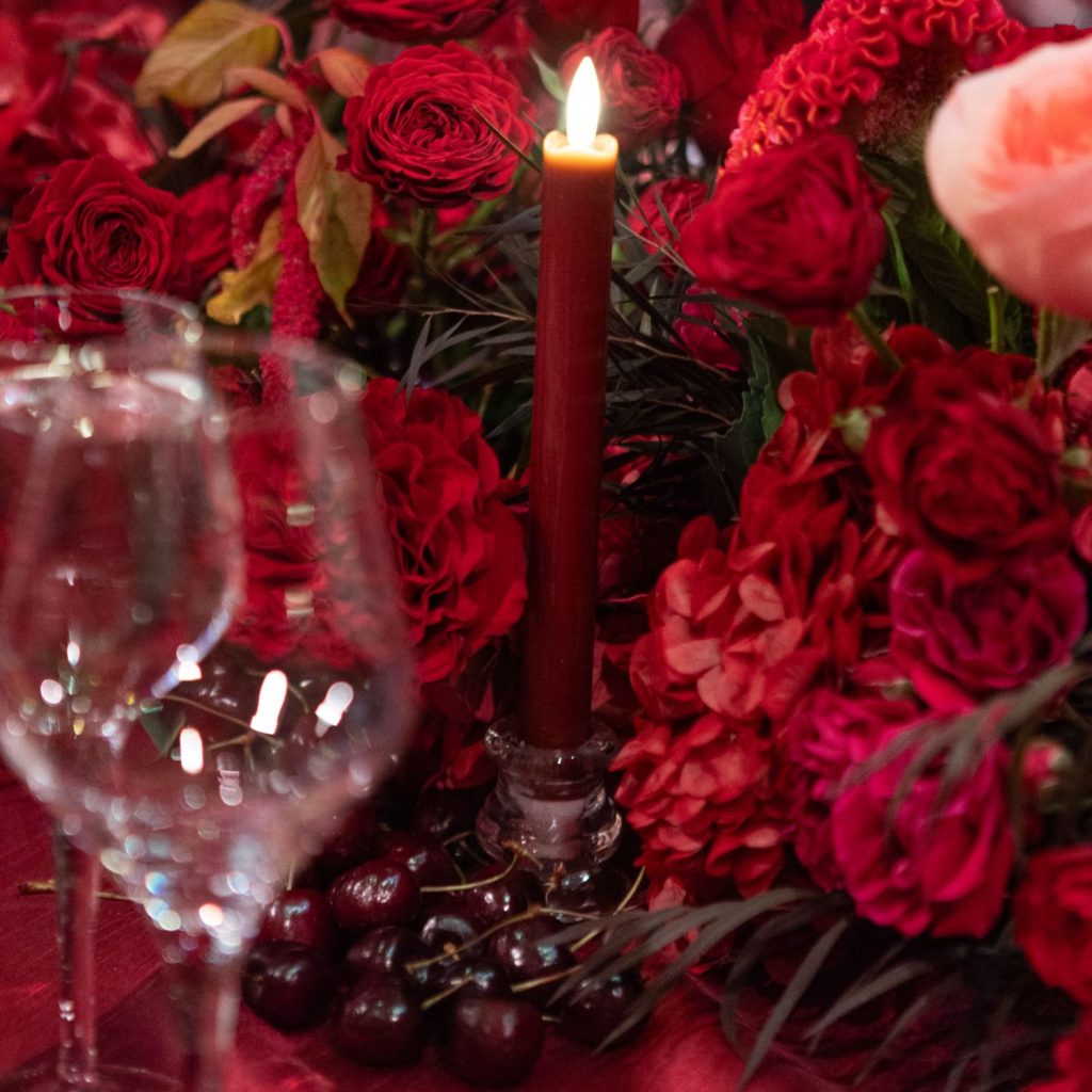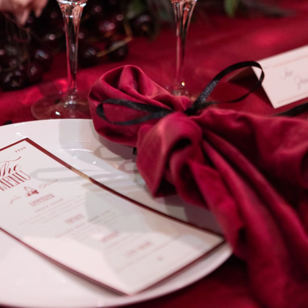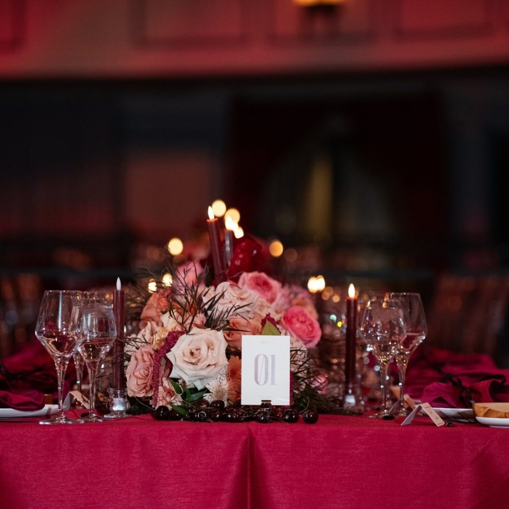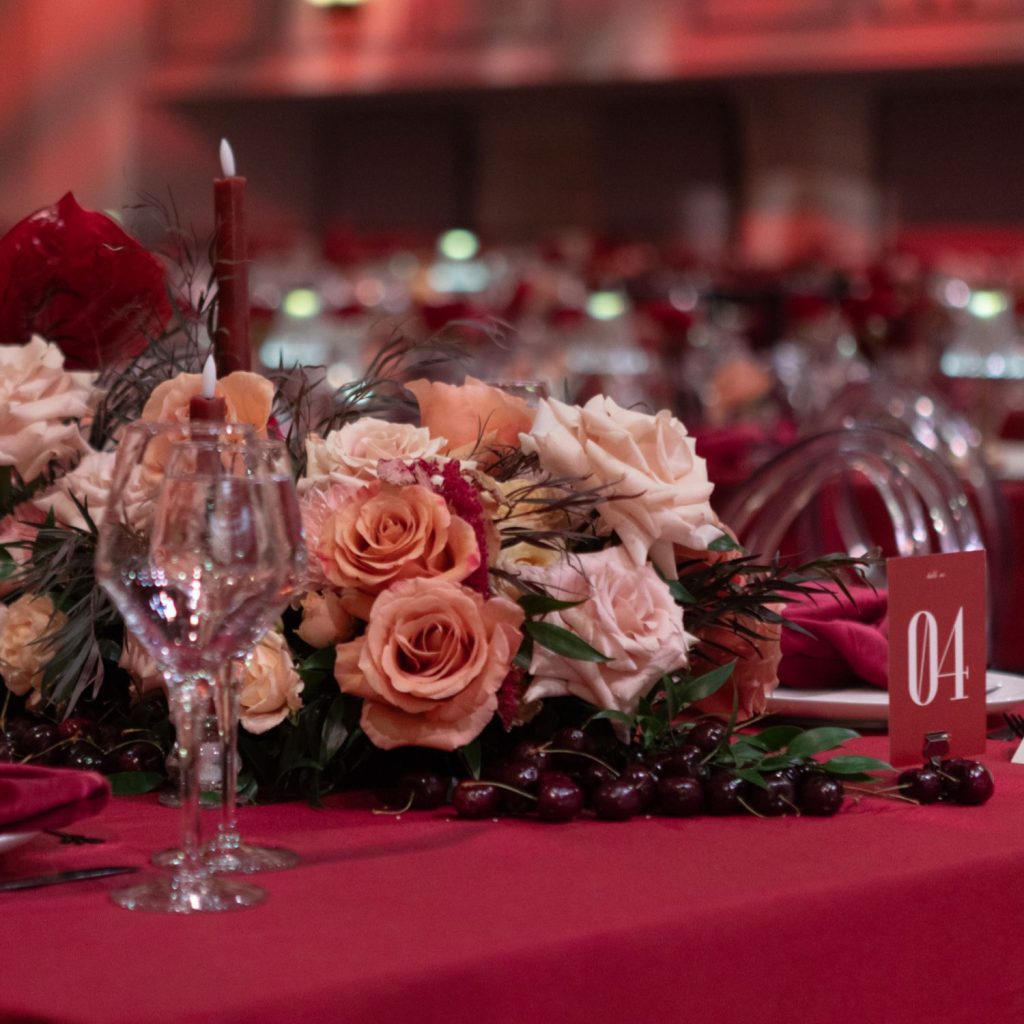 “I loved working with Sara and Aaron,” shared Monica at Mon Amie Events. “They trusted their professional team and allowed our ideas to help shape and influence the design of the celebration. In their case, the dynamic use of red really was a showstopper and I am thrilled Sara & Aaron loved it as much as we as a team enjoyed creating it for them. The saturation of crimson really was a wow, and seeing their faces when they saw the space was so special. After working with them for 2 years, it was really rewarding.”