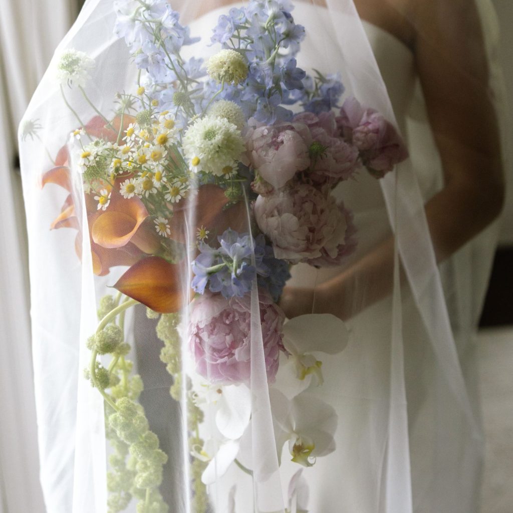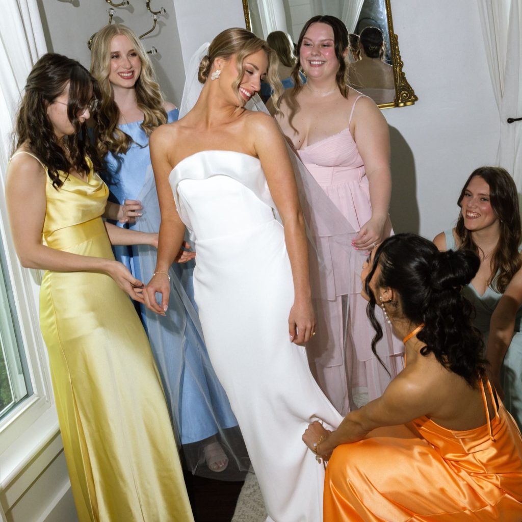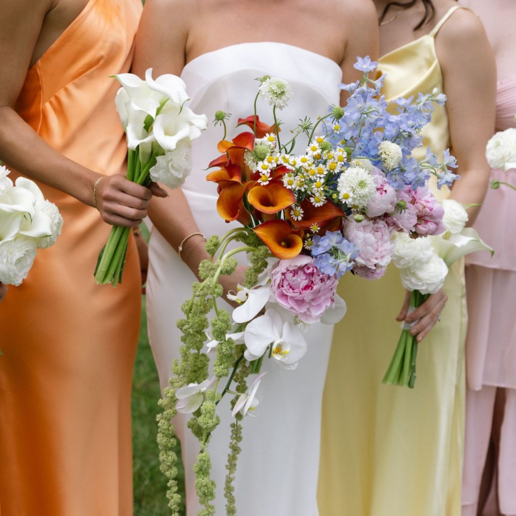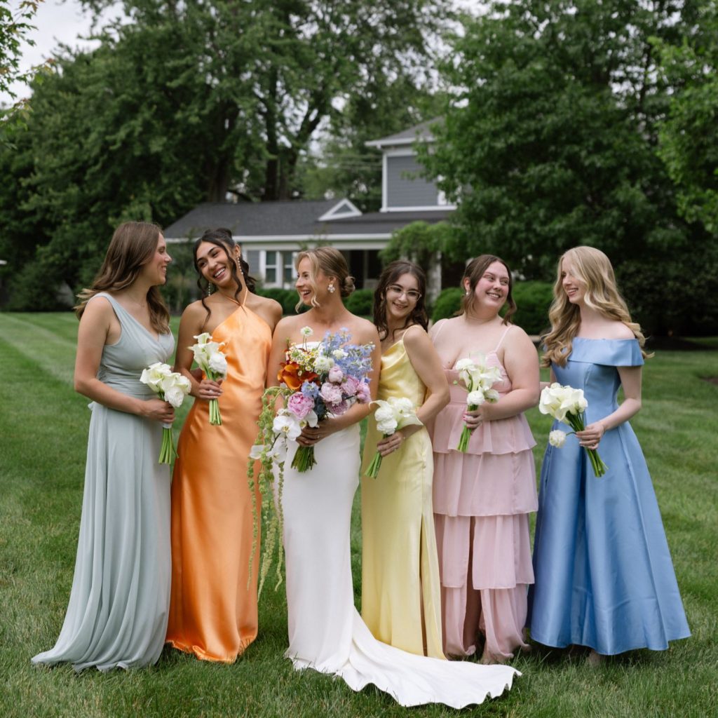 From the jump, the color palette set the tone. Instead of sticking to one safe shade, the bridal party was a walking sunset—think pops of marigold, soft peach, and a dusty sky blue that made the greenery of the gardens shine.