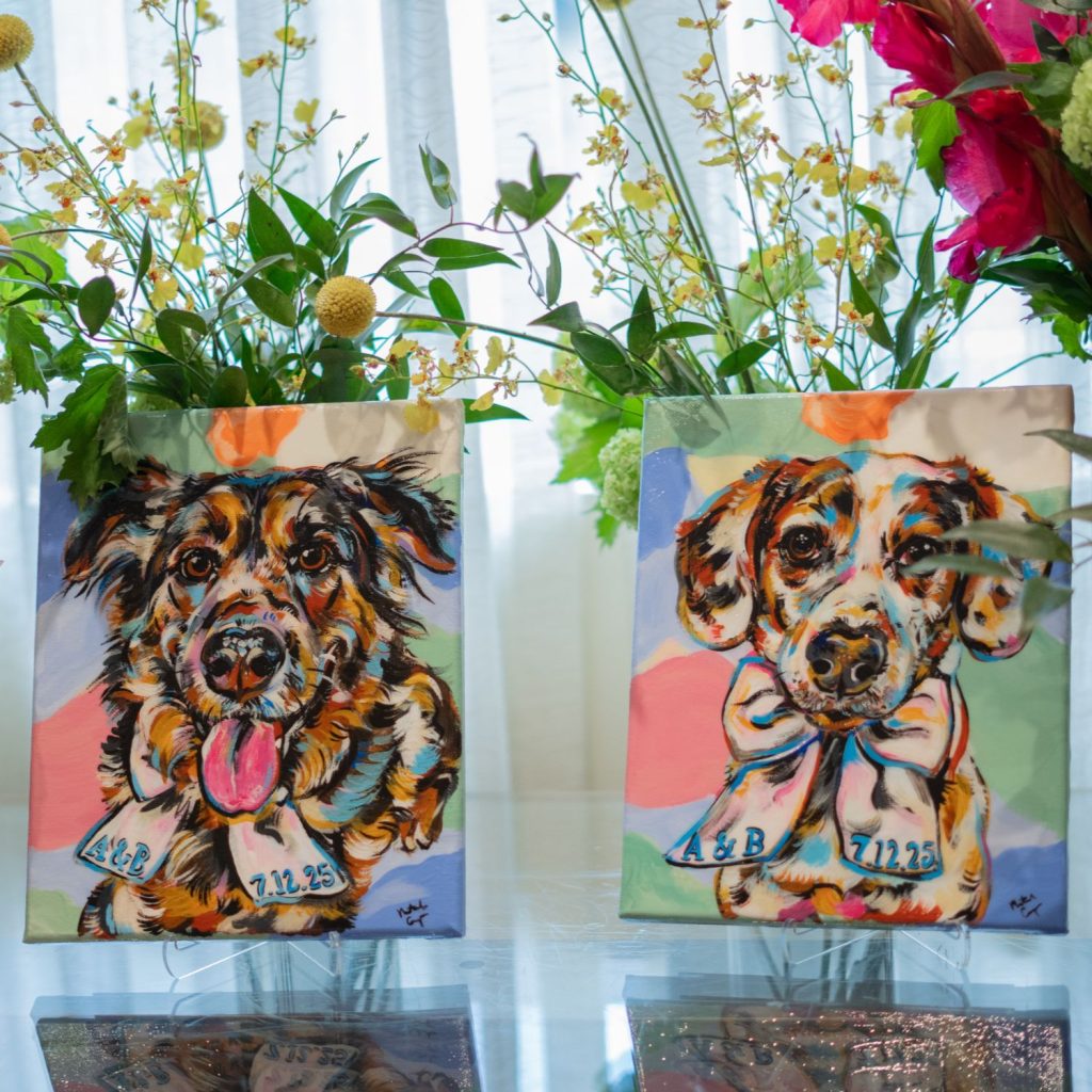 They tucked meaningful details throughout the evening—from cocktail napkins printed with their first-ever Bumble exchange to custom sorbet-colored portraits of their beloved dogs that guarded the dance floor.