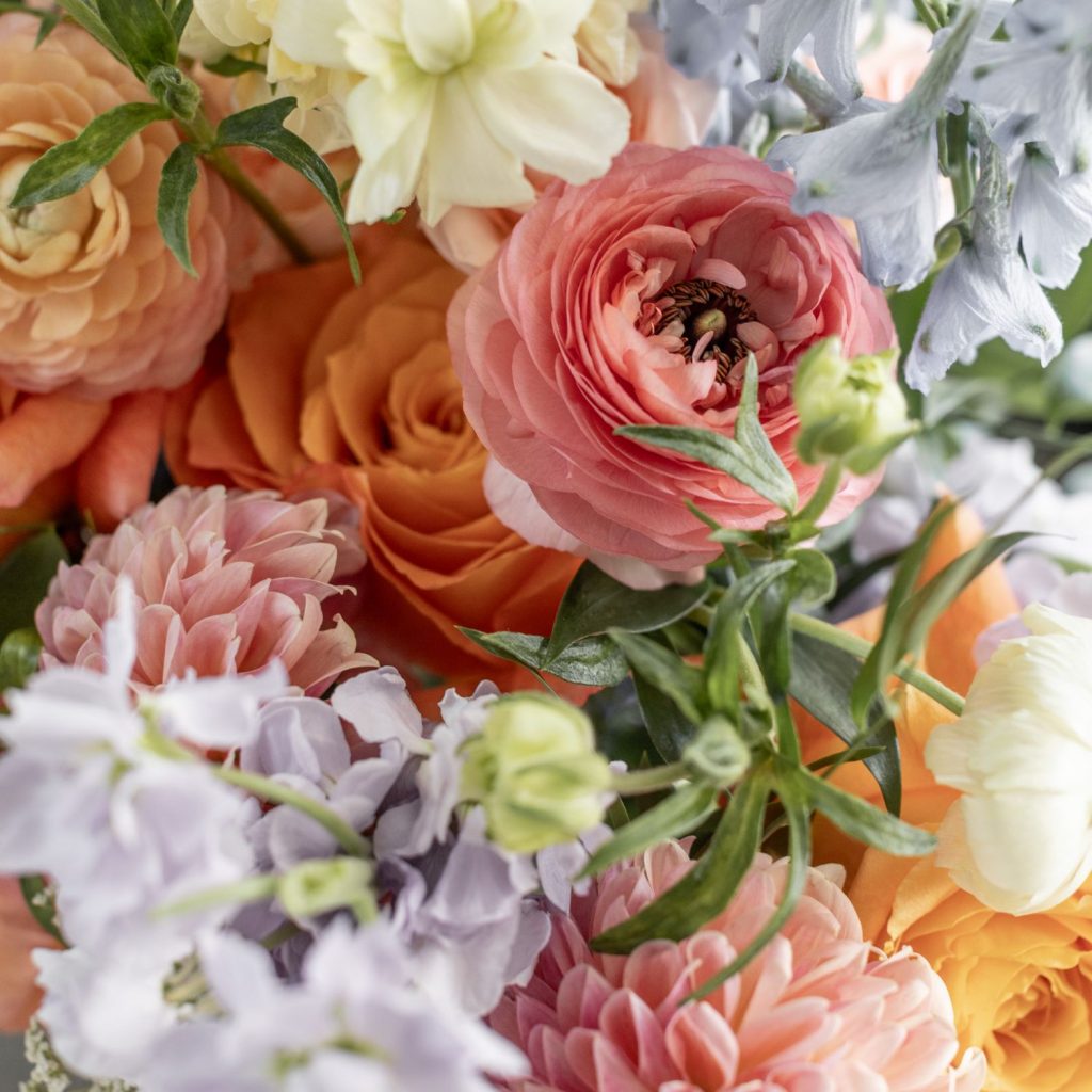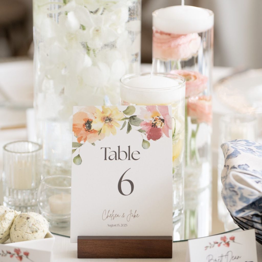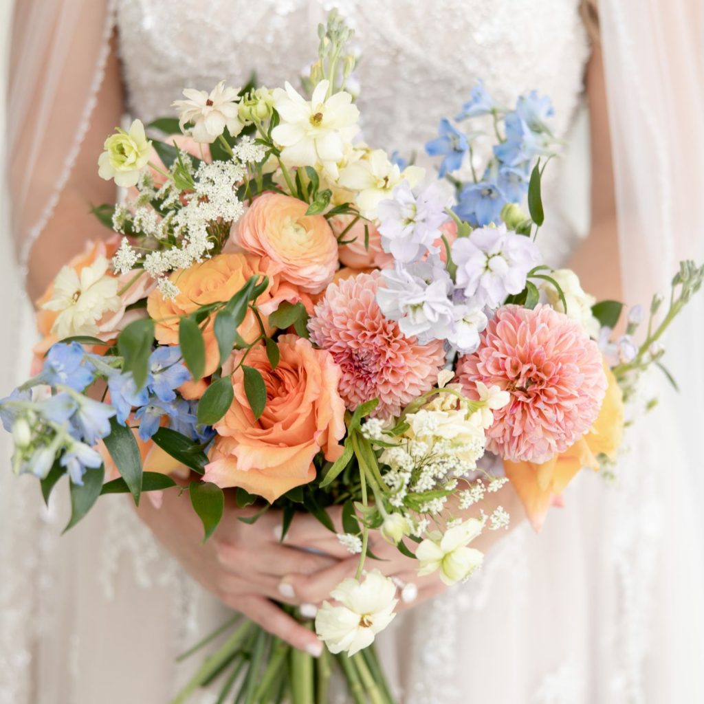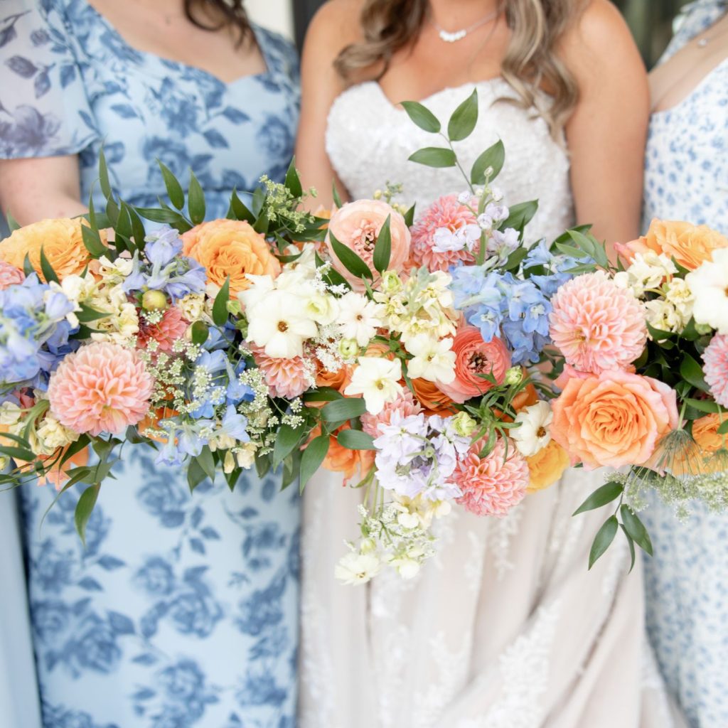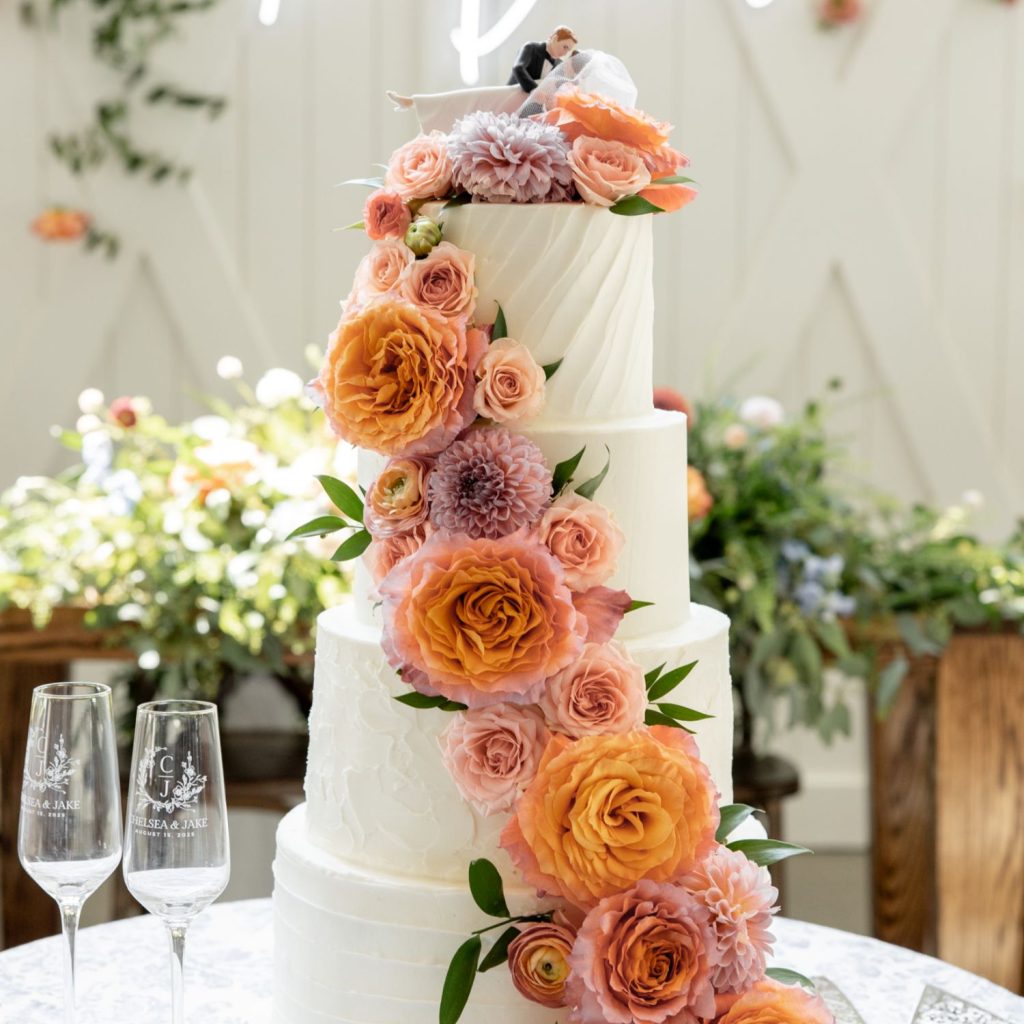 Chelsea and Jake’s wedding was full of color, with peach, coral, and blue woven through their florals, cake, and reception design. A four-tier statement cake from Cake Me Happy, finished with cascading blooms, became one of the standout details of the day.