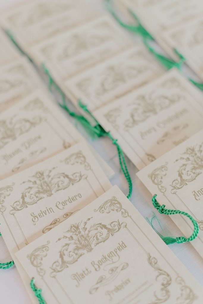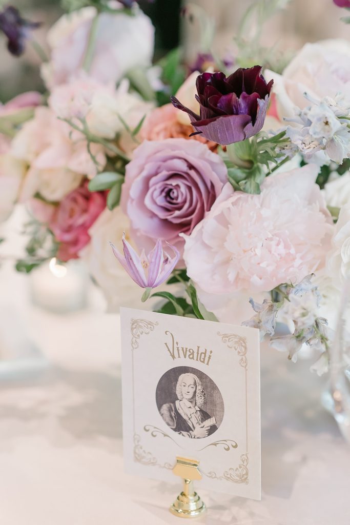 The bouquets blended roses, lilac, ranunculus, and delicate blooms that tied the day’s colors together beautifully. Each table was named after a classical composer—Vivaldi among them—a subtle nod to their love of music. Gold chargers and green napkins added warmth to the elegant setting.