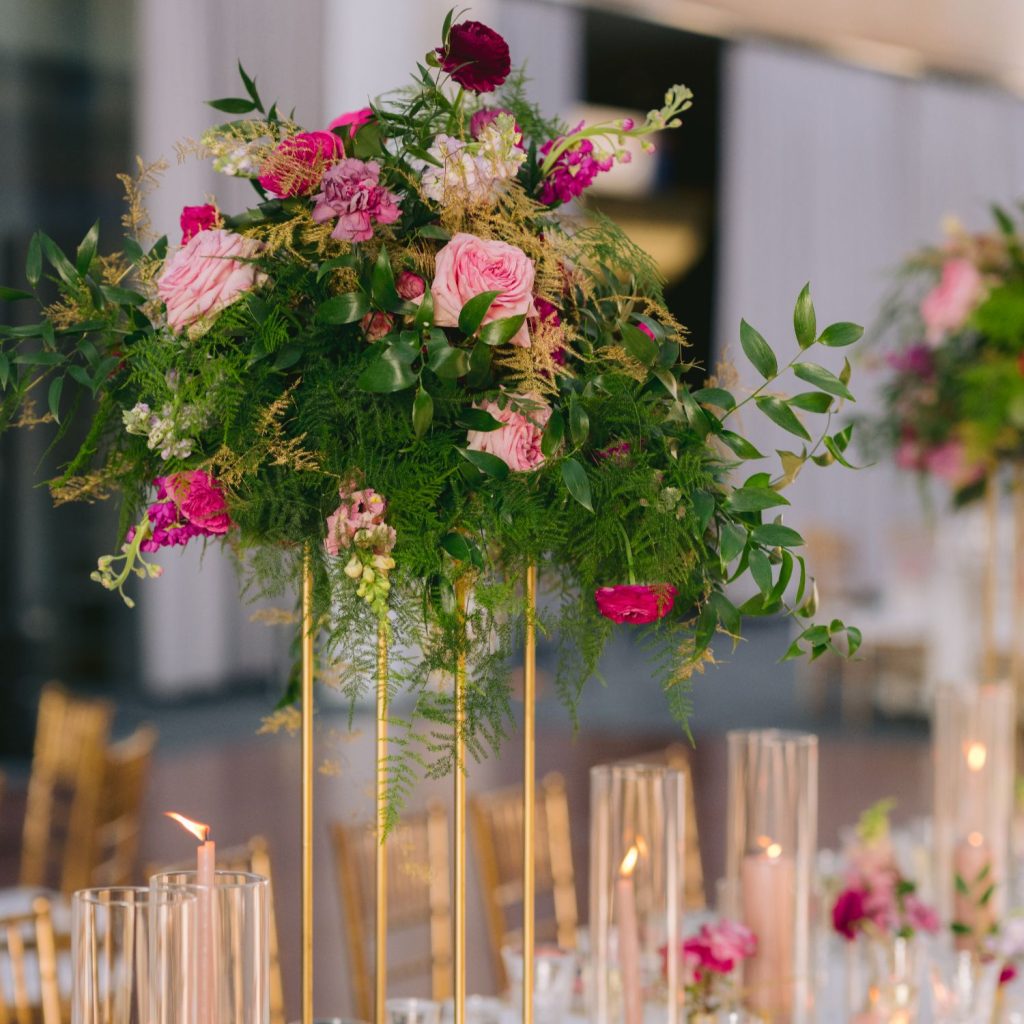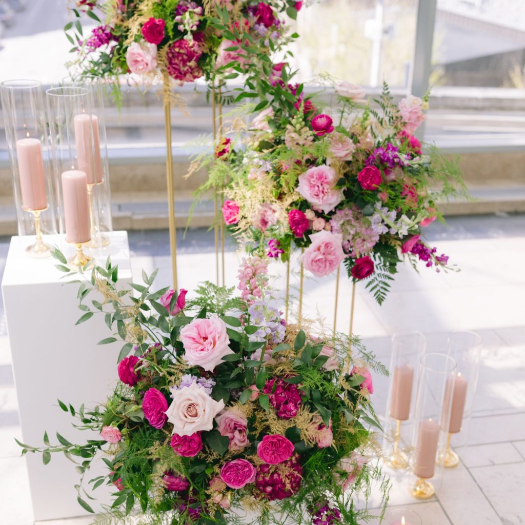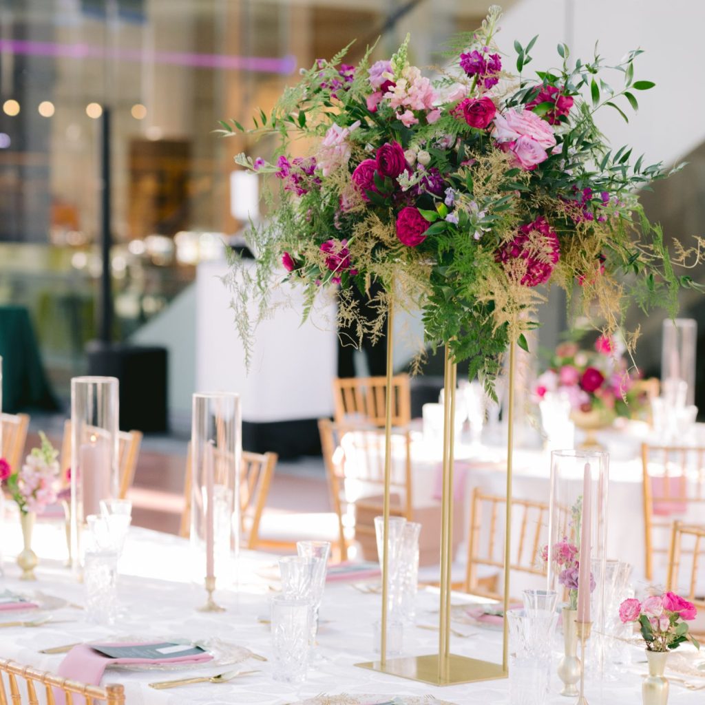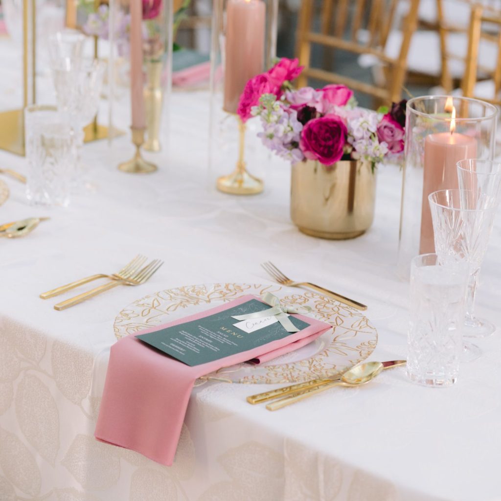 Duet Floral designed breathtaking arrangements in shades of fuchsia, blush, ivory, and soft lilac. From the lush bouquets to the delicate bud vases on the tables, each bloom added romance and a fresh, springtime vibrance. Rows of glowing pink tapers and crystal glassware gave the reception space warmth and intimacy, perfectly captured in the photos.