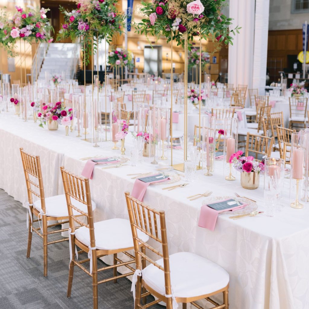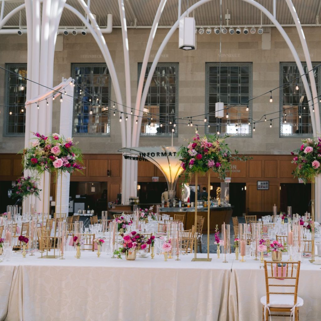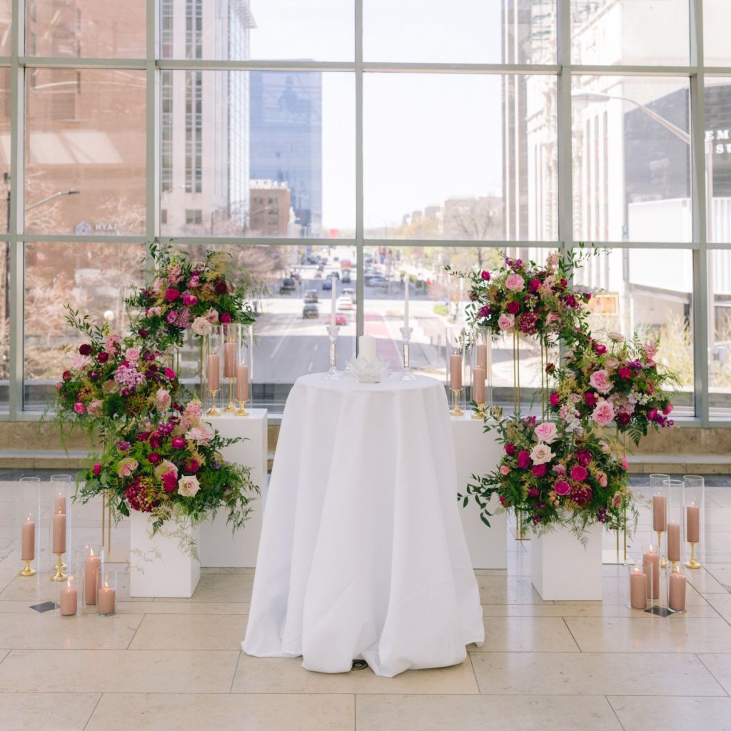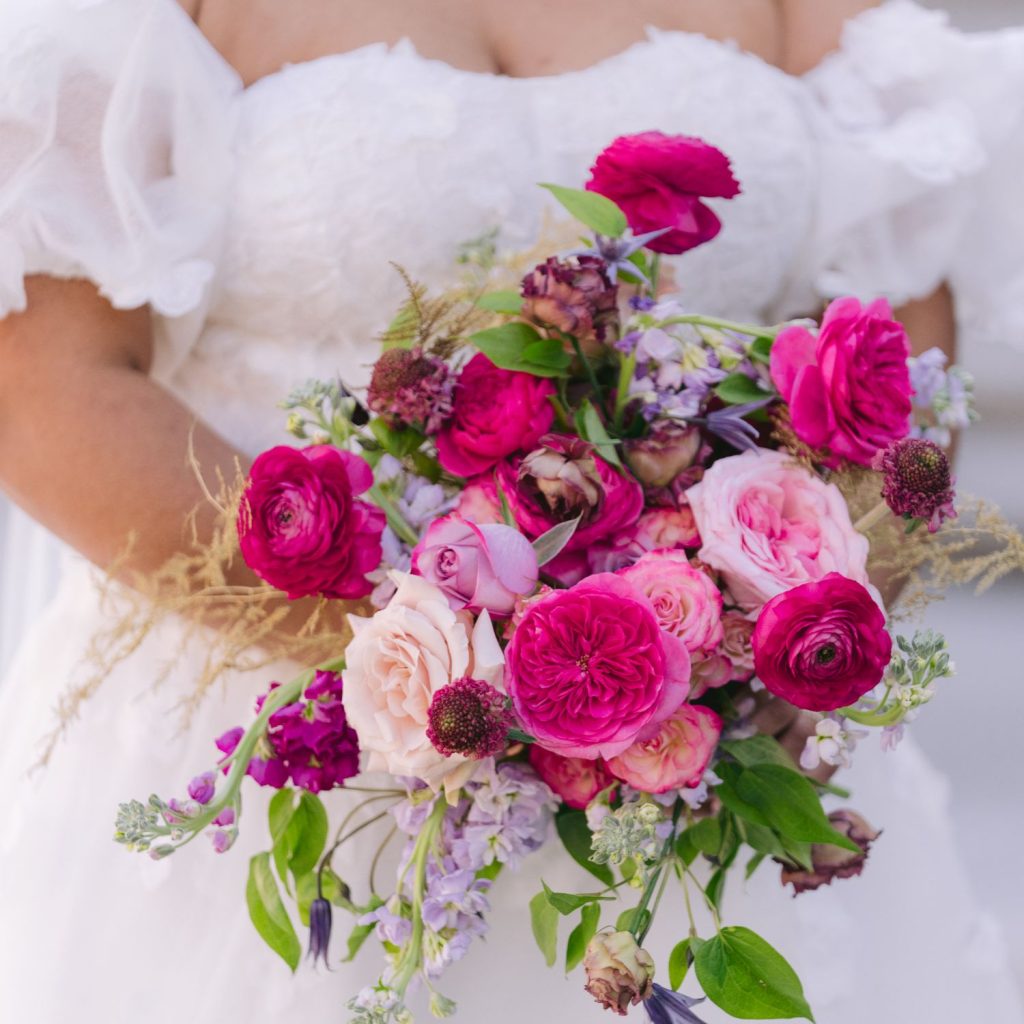 Duet Floral designed breathtaking arrangements in shades of fuchsia, blush, ivory, and soft lilac. From the lush bouquets to the delicate bud vases on the tables, each bloom added romance and a fresh, springtime vibrance. Rows of glowing pink tapers and crystal glassware gave the reception space warmth and intimacy, perfectly captured in the photos.