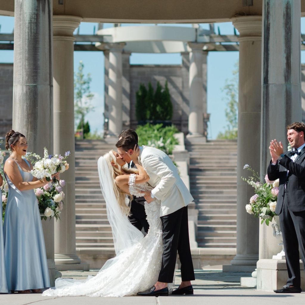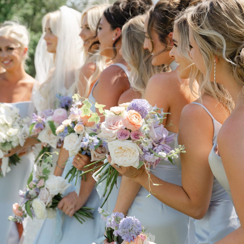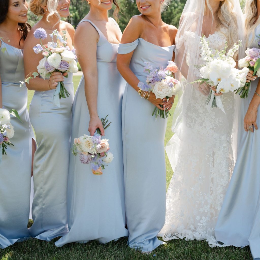 Annie glowed in an off-the-shoulder gown with delicate appliqué. John matched her perfectly in a white dinner jacket and black bow tie — timeless and confident. Her bridesmaids wore dreamy dusty blue Jenny Yoo gowns from Bella Bridesmaids — each in their own silhouette, from off-the-shoulder to spaghetti strap — carrying airy pastel bouquets that tied the whole look together beautifully.