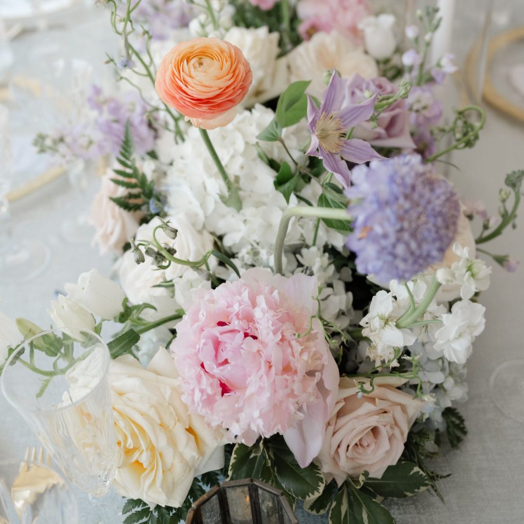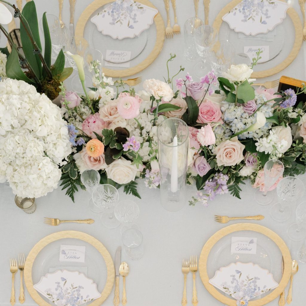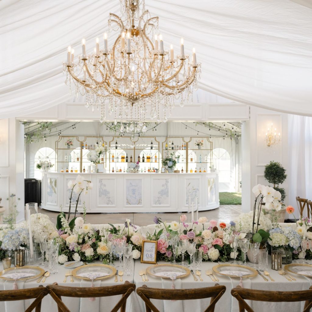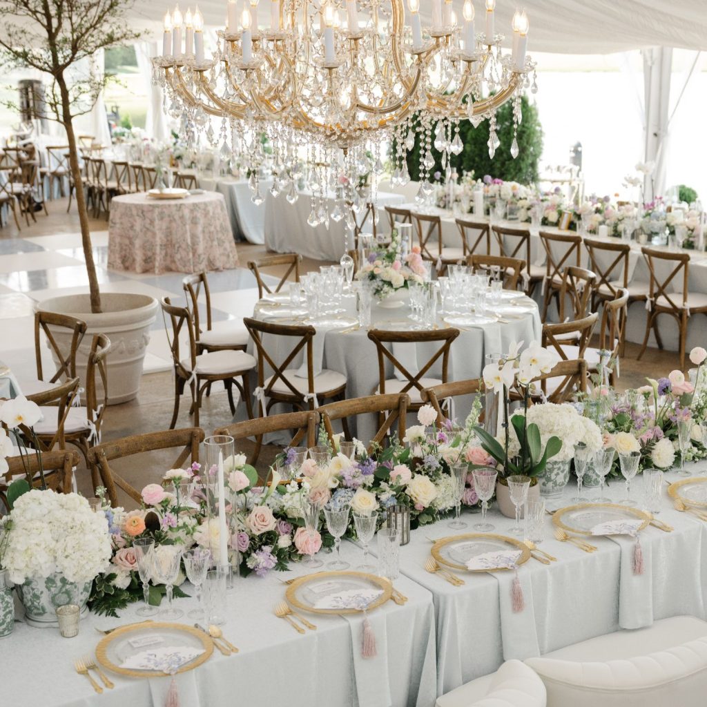 That feeling carried through the whole day. The tented reception space was filled with soft garden florals — blush, peach, lavender, ivory — with sweeping drapery and glowing chandeliers that felt grand and intimate at the same time. The details were thoughtful without being overdone: ornate welcome signage, guest parasols, tablescapes that felt lush and layered but never fussy.
