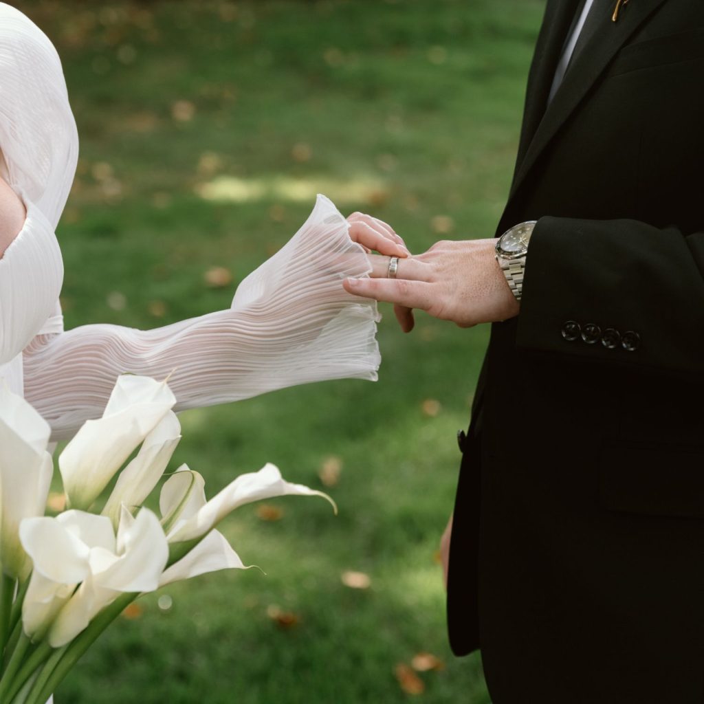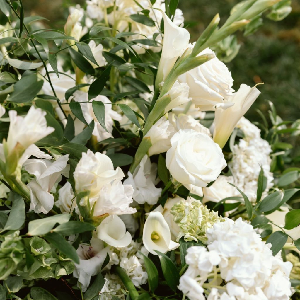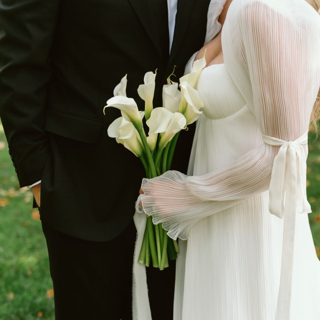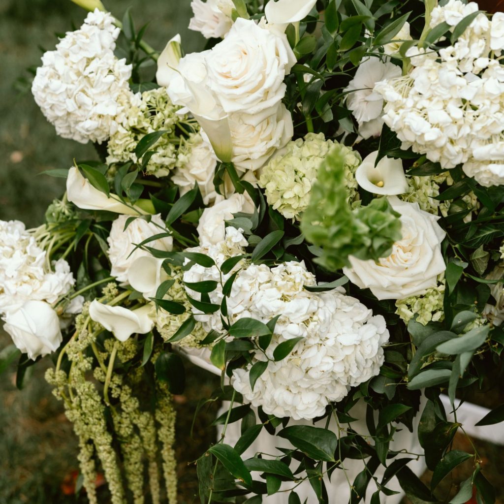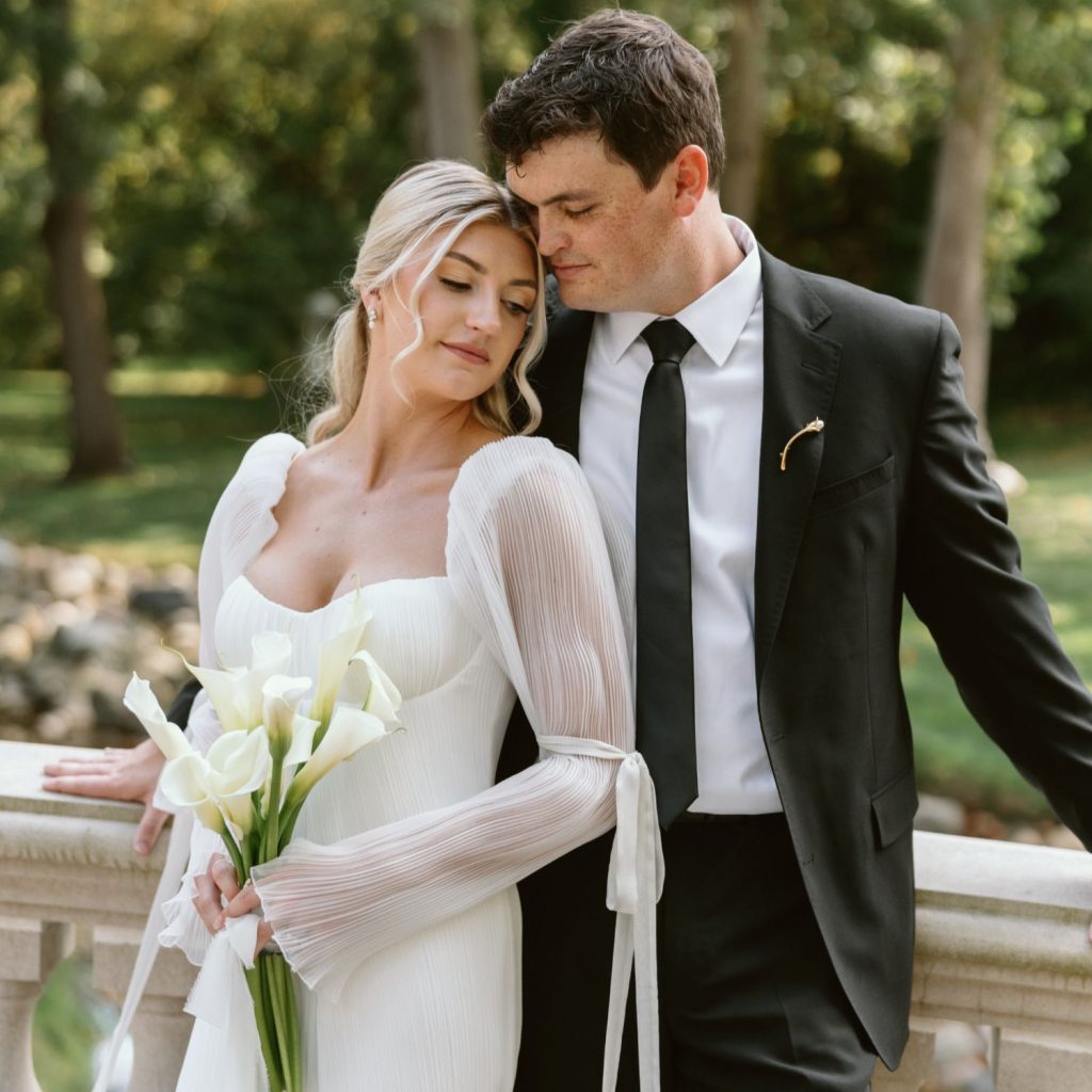 The floral design by Duet Floral brought the couple’s vision to life with beautiful sophistication. Katherine from Duet Floral shares their approach: “For the flowers at Claire and Luke’s wedding, we aimed to create designs that complemented the elegant style of the venue. We used many classic blooms, such as lilies, calla lilies, and roses, while also incorporating a modern touch with green hydrangeas and hanging amaranthus. The final result was a white-and-green floral palette that felt both intentional and contemporary. From the all-calla bouquet to the rose lilies for the bridesmaids and centerpieces, each arrangement was sleek, modern, and reflective of their style.”